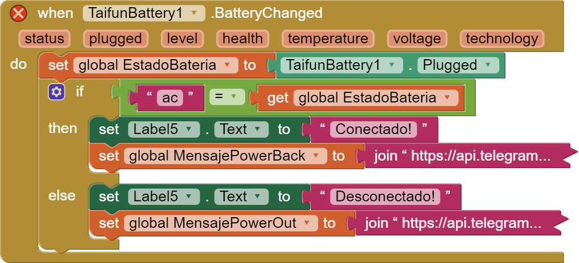 I have this block (currently not running in background), that checks if the cellphone lost the power connection and, if so, stores a message in a variable.