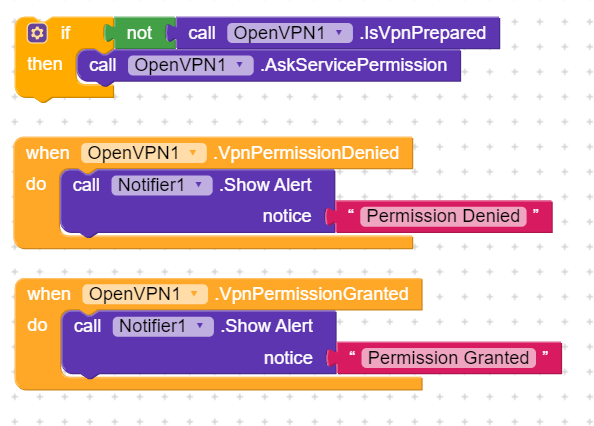 | IsVpnPrepared | Returns whether VPN Service has been already prepared or not. If returns false then you'll have to ask Service Permission first. |