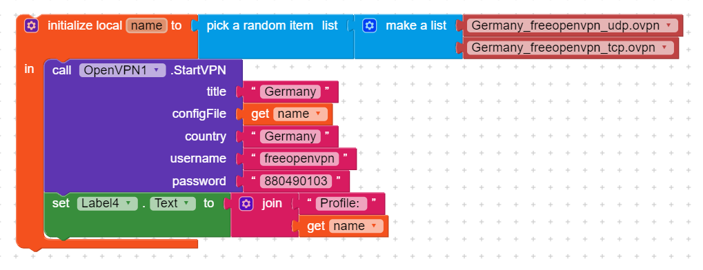 | StartVPN | Start VPN service with provided configFile and other credentialstitle | textconfigFile | textcountry | textusername | textpassword | text |
