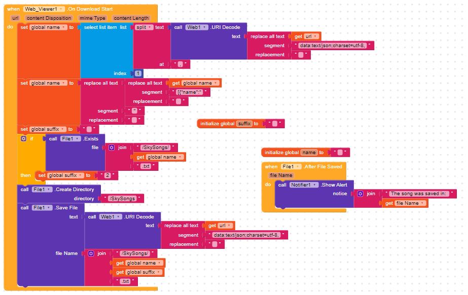Hello, i made a website ( https://sky-music.herokuapp.com/ ) and i was trying to turn it into a super simple app for android, i managed to get everything to work correctly, including the input and account system, but how can i make the site download a file?, i use this inside the website to download the file: