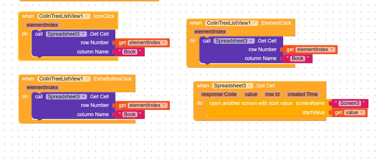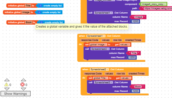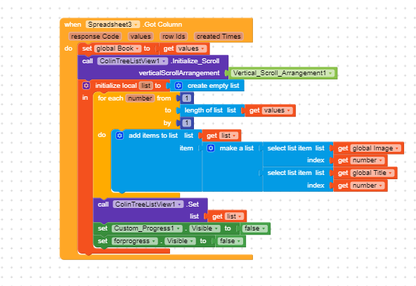 When the book store values then call colintreelistviwe to set arrangement where listview show their values and get initialize local to make a list and set empty list block. then take for each block from the control section and set length of list block to got values (all values in the list). and add items to the list. In colintreelistview extension first, we set image, title, and subtext. So, first, I get values from image variable and then from the title.set colintreelistview to set list (get list block from initialize local list) and set notifier to dismiss progress bar.