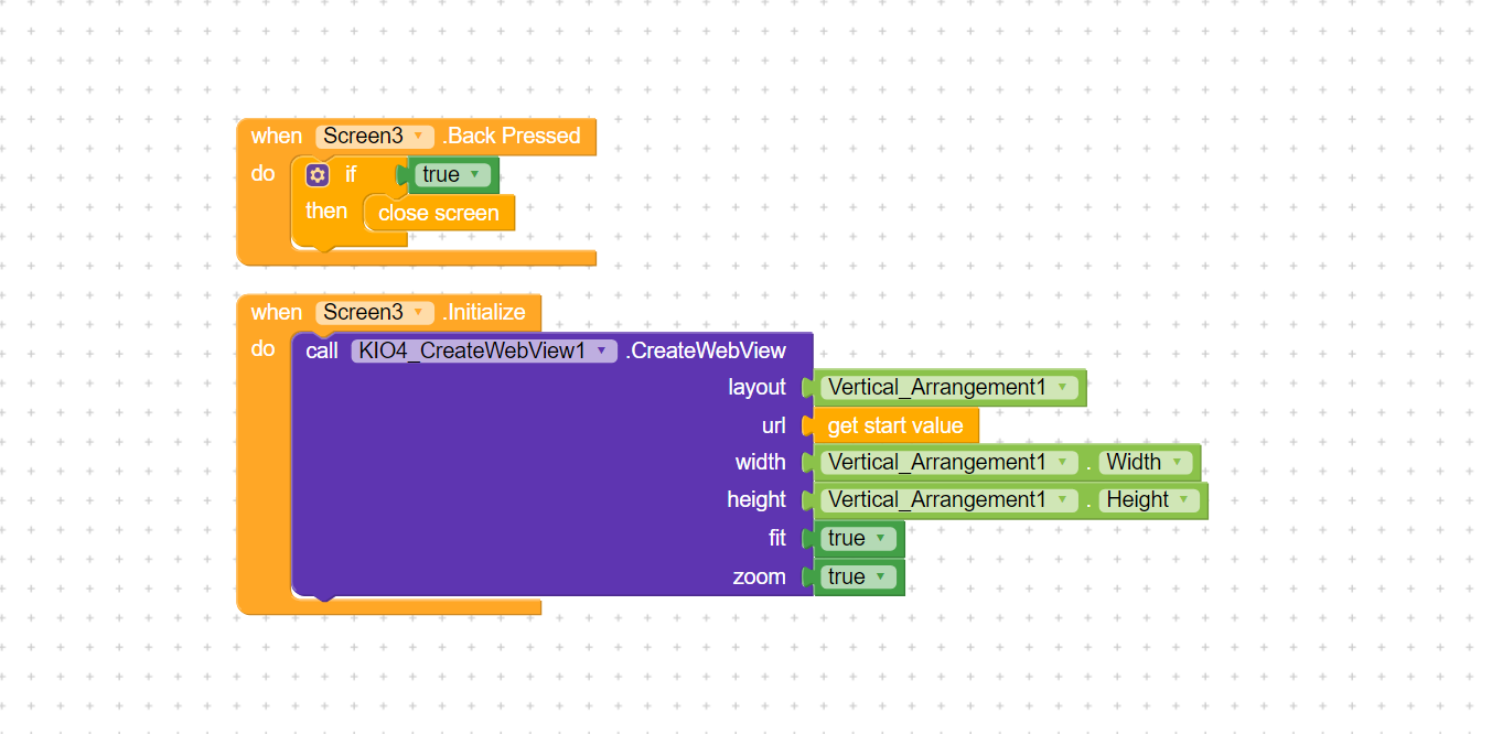 When Screen3 initialize call creatwebview block to set layout vertical arrangement and set URL to get the start value and set width height to the arrangement.
