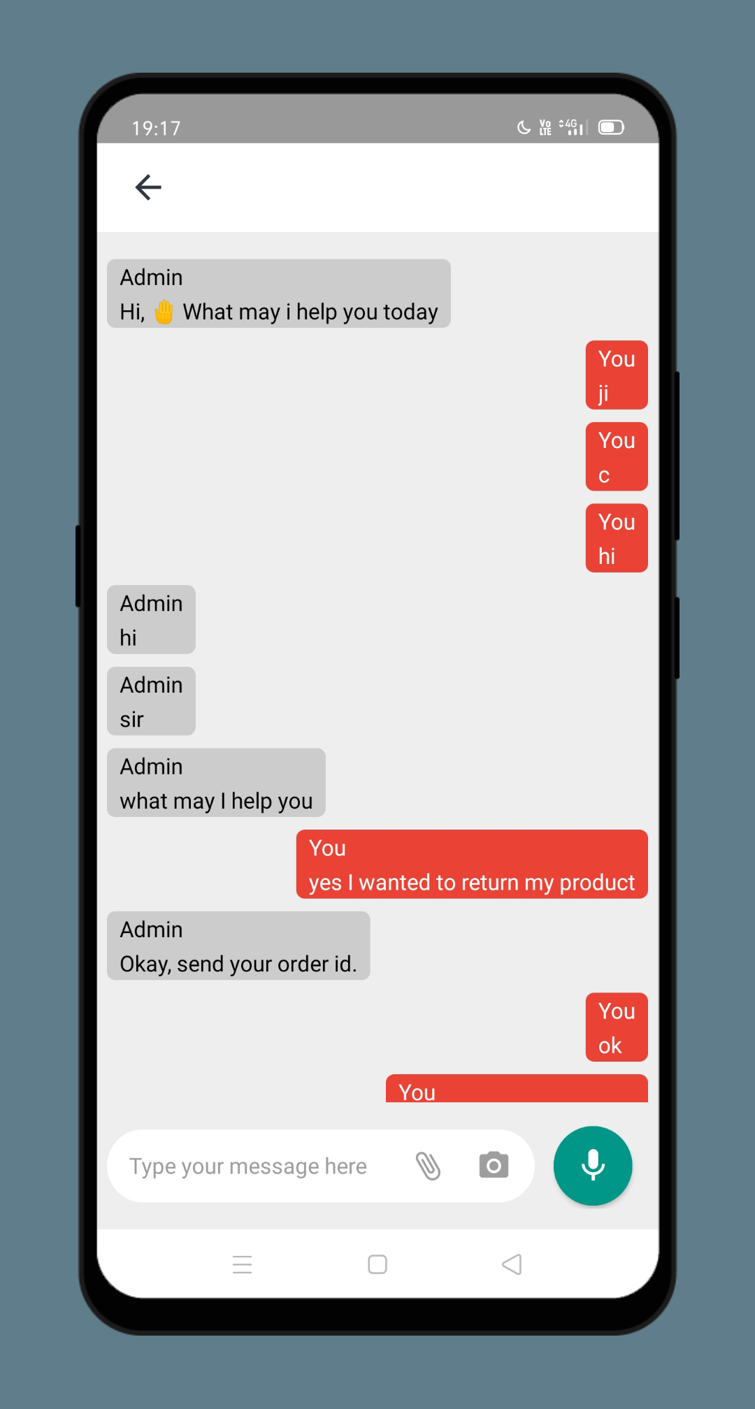 User can make the chat with admin. and for some keywords i setted the messages. and user can send the images from gallery and they can take photo from the camera of mobile.(For trial you can use the keyword like return or fault, Thanks. if you want then you can set this keywords and messages).