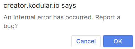 In Creator, I drop down the Test menu and hit “Connect via USB”. I get the Connecting dialog on the Creator. Then, almost immediately, I get the Internal Error dialog. I wait two minutes, nothing happens. If I hit Cancel (Internal) Error 15 times or so, nothing happens. If I hit “Report Error”, an Open Bug page pops up. I close that page, go back and both dialogs are still displayed. So now, I hit Cancel Error about 14 times and the dialog disappears, the Connecting dialog disappears and my project will finally display on the phone.