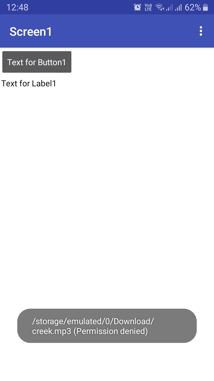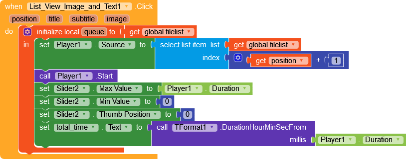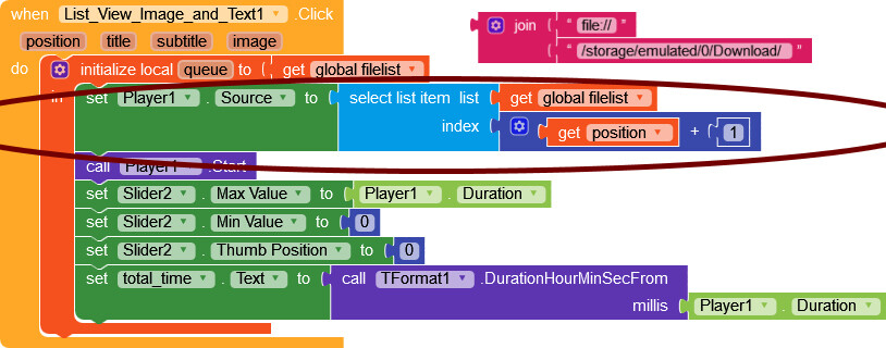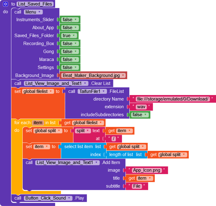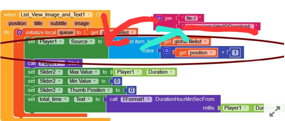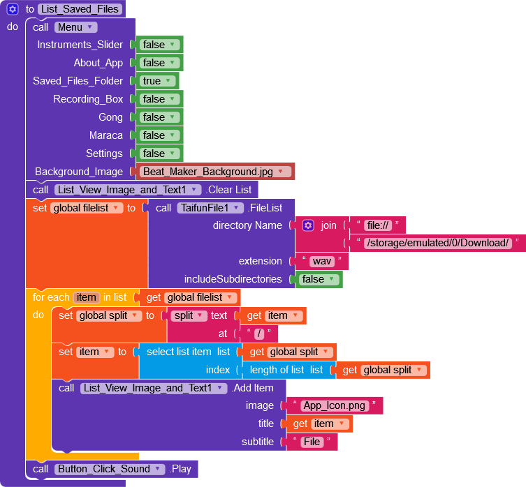 But still there is a problem while reading file, In my android 8 version its working fine. But in android 11 the sound in not playing when i select any from the list, here are the blocks -