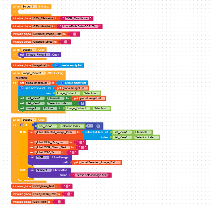 ImagePicker.Selection → stored in Selected_Image_Path → sent to OCR extension and File.SaveFile.