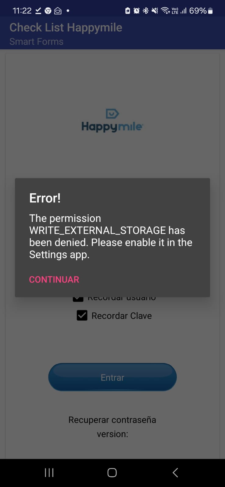 hello I had the same problem, the error 908 WRITE_EXTERNAL_STORAGE permission is denied appears in my app.