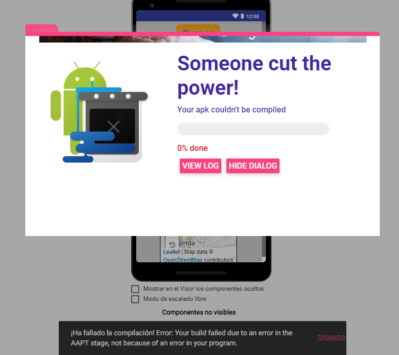 Hola, tengo un problema al compilar mi app para generar archivo apk. Al generar, y cada vez en un porcentaje distinto, me aparece mensaje de error siguiente, incluido el cuadro de diálogo inferior donde dice que no es error de la app. ¿podría alguien ayudarme?