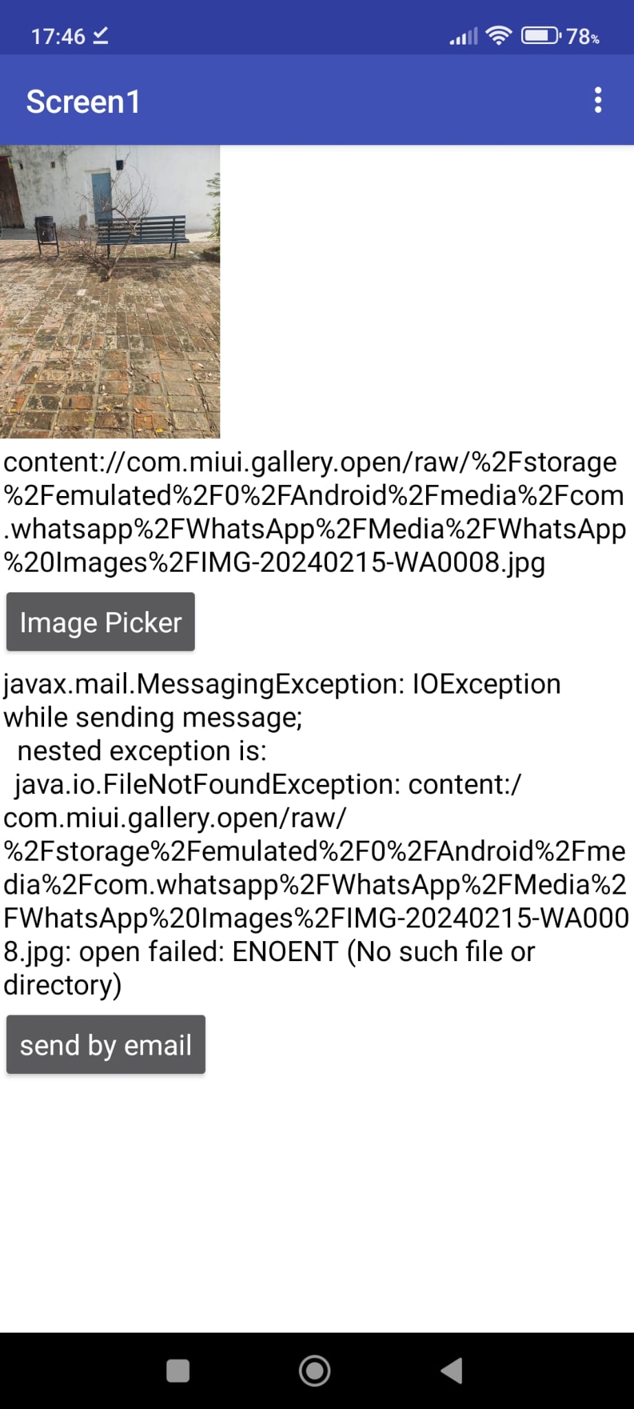 The selected image is successfully loaded on the screen. However, upon clicking the “Send By Email” button, the email fails to send and the following error appears: ENOENT.