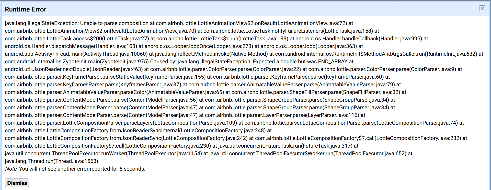 I also had this issue, after investigating a bit, I believe the problem is due to the version of Lottie used to create the animation.