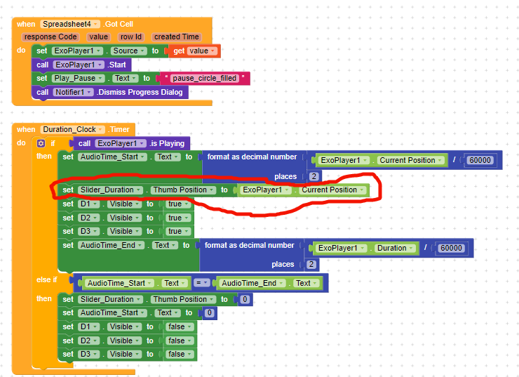 My expect with this blocks is when the player is playing then a slider thumb position should follow the seconds accordingly up to the last of the song when ended.