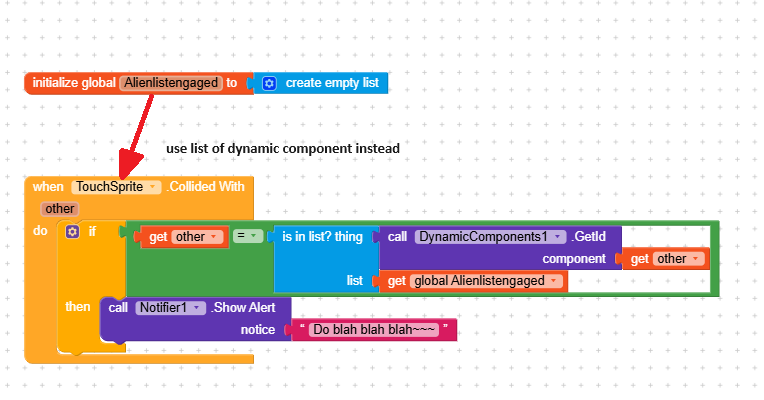 In the picture i want to make this method use list of dynamic image sprite and do something if one or more in list hit or get hit by other thing. It is possible to do if yes can you show me how to build block pls.