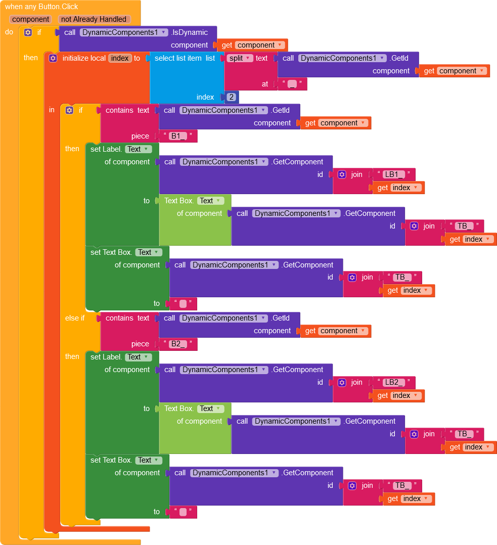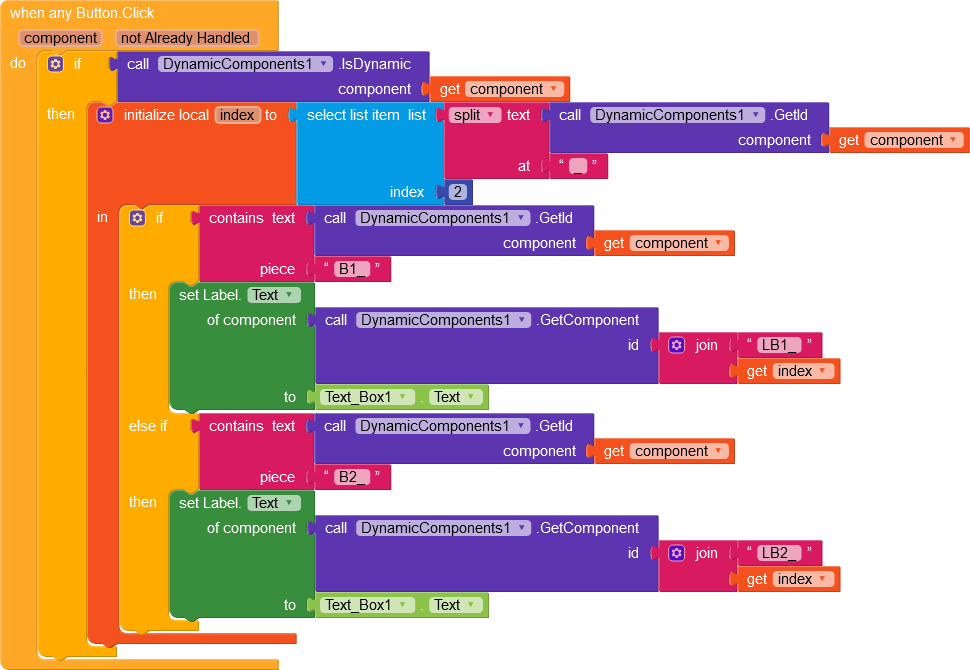 Don’t know exactly how you create your dynamic components. In my example I have two dynamic buttons B1_{ID }, B2{ID} and two dynamic labels LB_1{ID} and LB{ID}. When any button contains B1{id} is clicked then the corresponding label gets textbox’s text. This is just an example to help you understand how it works
