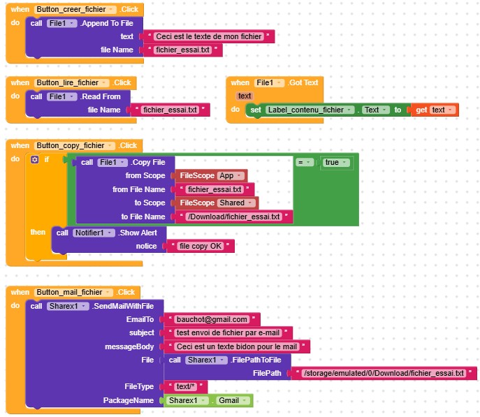 having been squeezed during several weeks by other duties, I am just resuming my attempts to send a mail with a file attachment, leveraging the latest inputs received on this discussion stream from Taifun (thanks a lot again !). Unfortunately I am not yet done, still facing a situation where I receive an error message stating that my file is exposed beyond app through ClipData.Item.getURI(). Here are my blocks:
