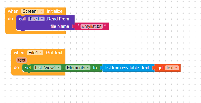 and store to a txt file in phone memory, read by Files component and after read use set in to any global like, set global list to , list from cvs row, get text, and after that set list view to that global, i have tried that, working