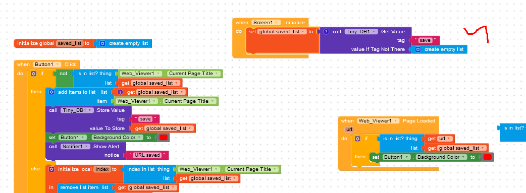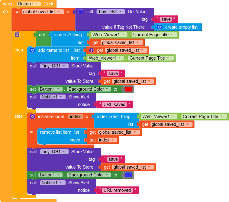If the current url is not in the tinydb list, Then Add items to the list and save the list in tinydb+ change the button colour to red Else remove the item from the list using index method + change the button colour