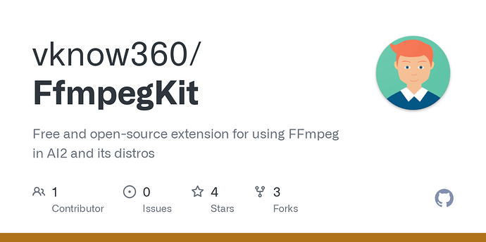 The FfmpegKit Extension is here to bring powerful media processing capabilities to your MIT App Inventor projects. Designed for ease of use and packed with advanced features, this free and open-source extension allows you to integrate FFmpeg into your apps effortlessly.