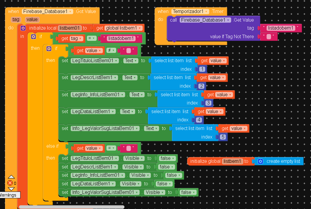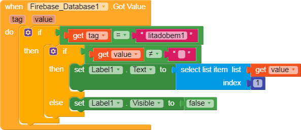 When Firebase Got value > if tag = listadobem1 if this is true > if value is not empty if this is false > else hidden label