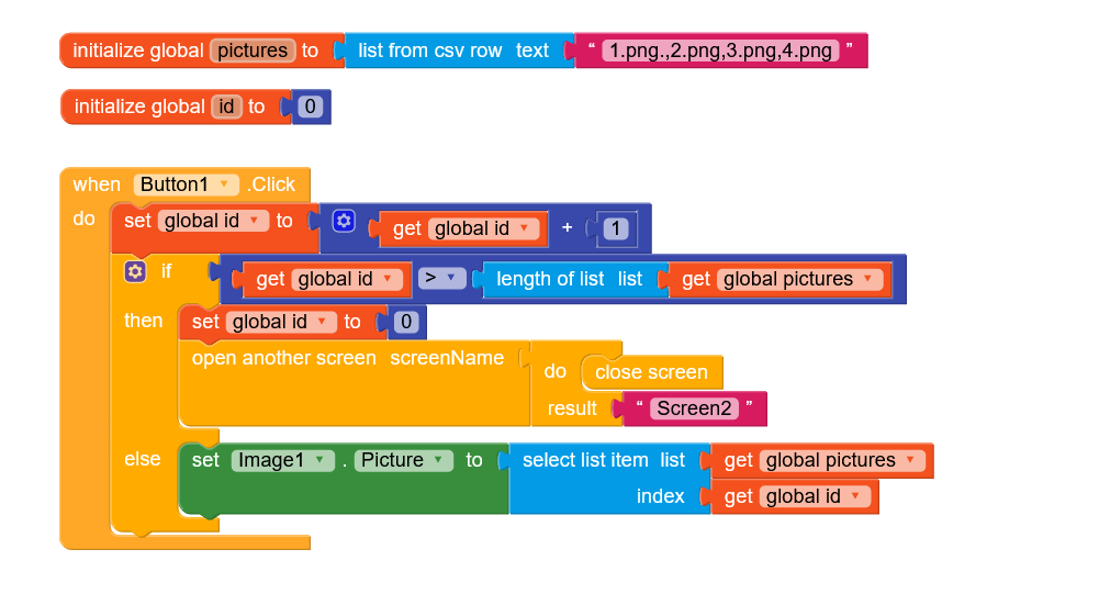 Hi. I have 24 images that I want to show one a time. For every button click, I want to display another image, how can I do that? Also, in the last button click, I want to open another screen. Hope you can help me. Thank you.