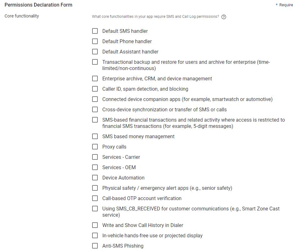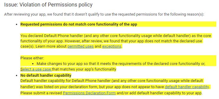 Hi, friend today I was trying to publish an app, where on-click button calling appears, But the app was rejected by google because of permission issue, so any suggestion which option I should select before I selected Default Phone handler. Please follow the image.