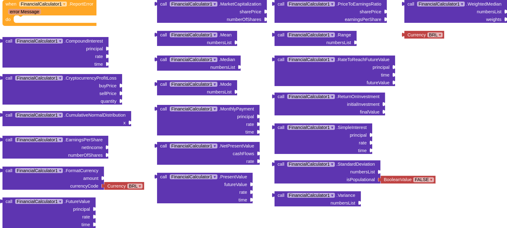 The Financial Calculator extension provides various blocks to perform calculations and interact with your app. Here are some of the key blocks: