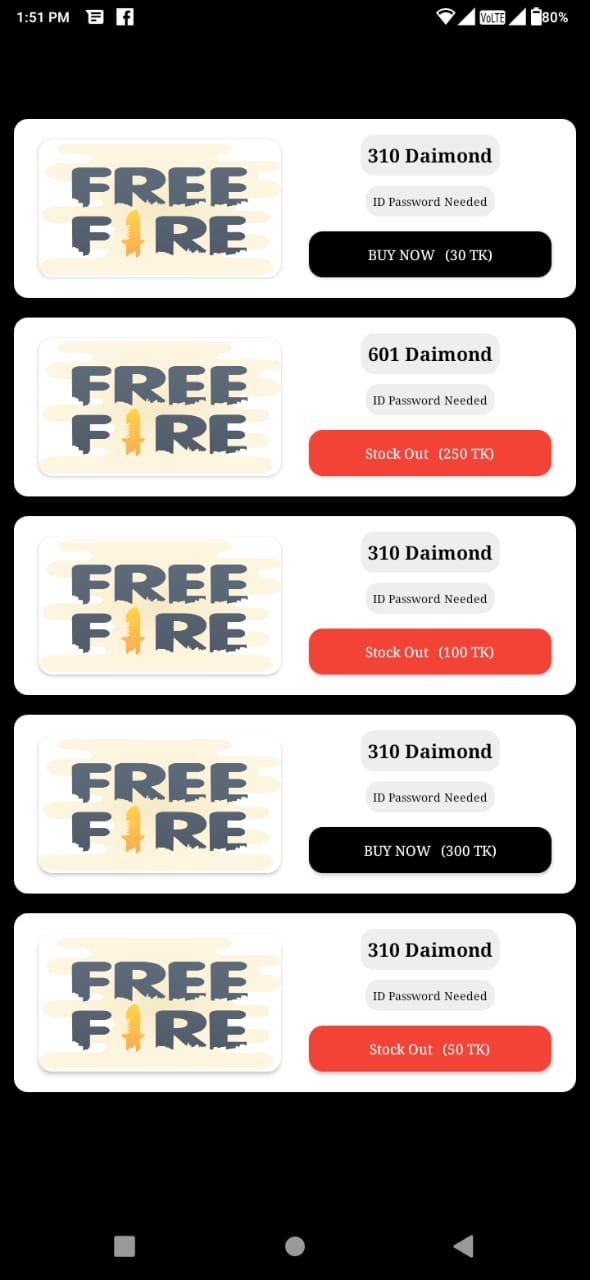 This application is a free fire diamond topup application. Here you will find beautiful login and signup screens. Cool home menu