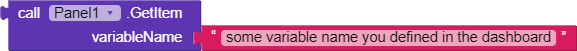 This block takes in a variable name (defined in the web dashboard) and returns the value.