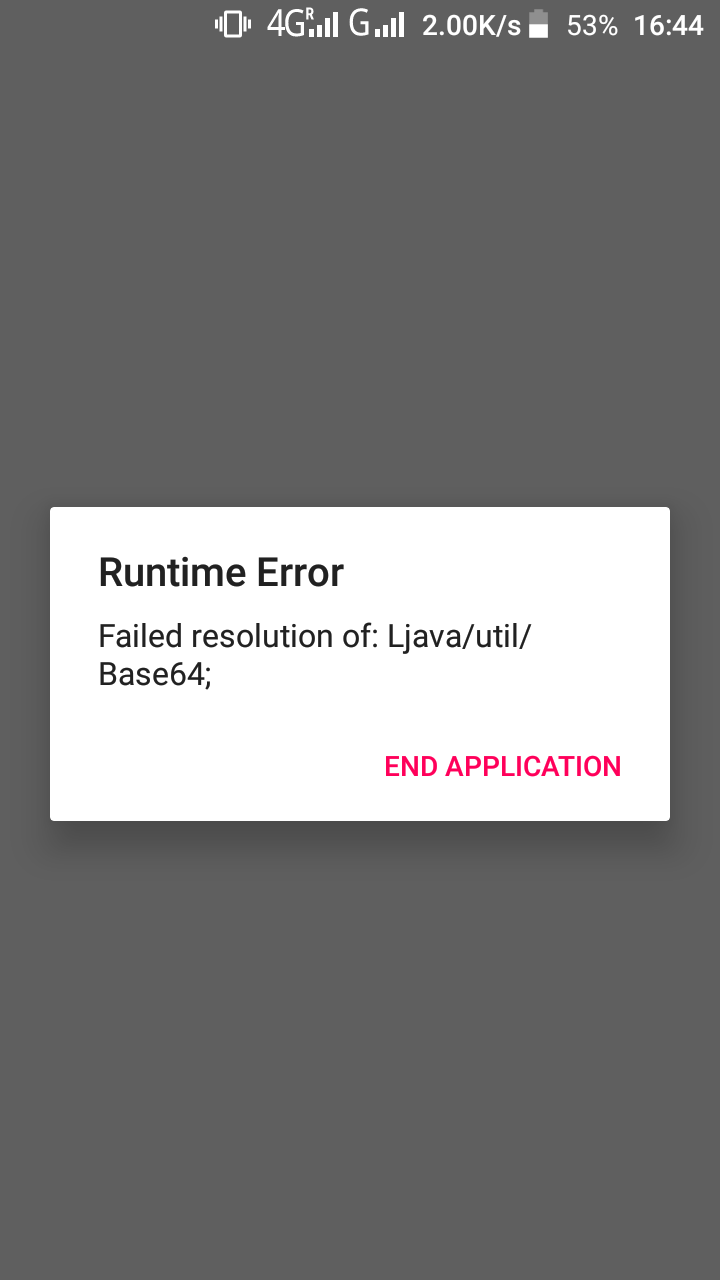 This error is because Base64 (java.util.Base64) class was added in api 26 (android 8).Which means that it wonât work on earlier android versions.