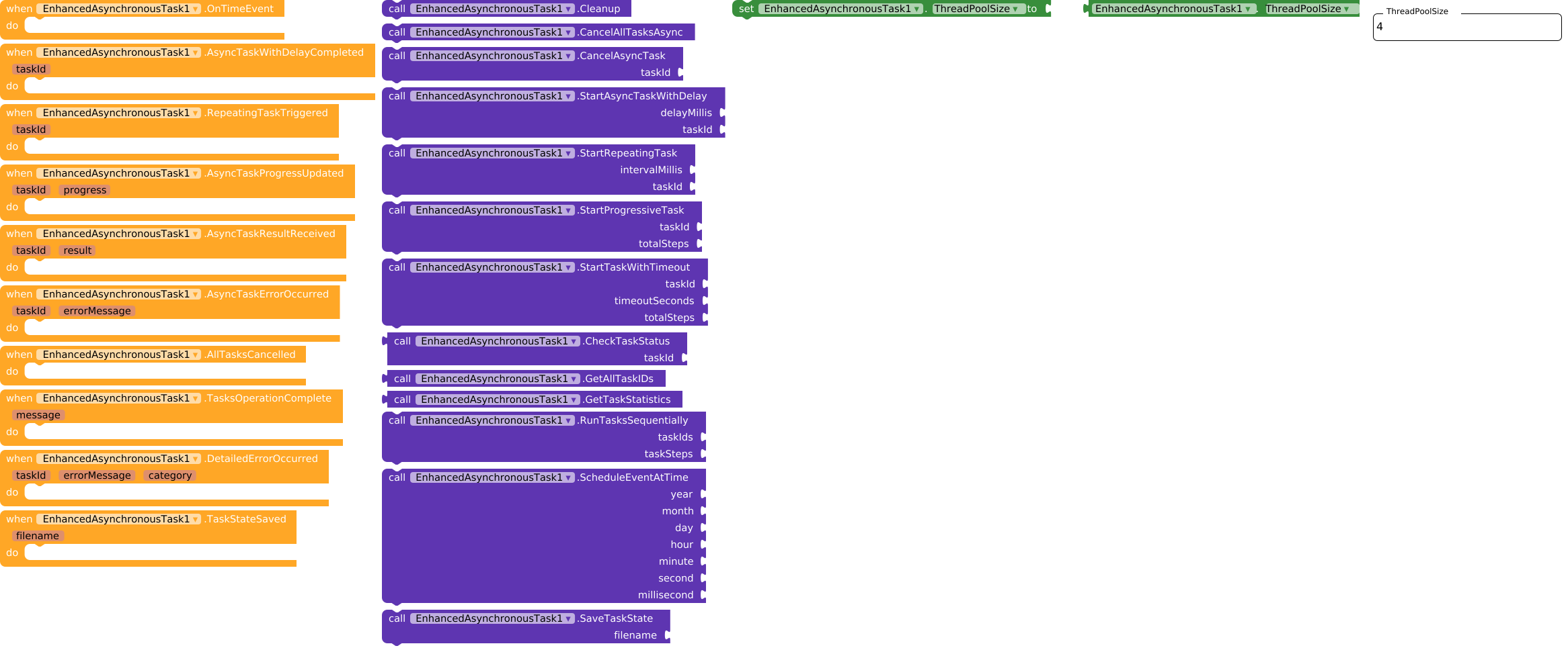 This extension provides advanced asynchronous task management capabilities for MIT App Inventor 2 applications. It uses Java’s ExecutorService to handle background operations efficiently, with features like task scheduling, progress tracking, timeout management, and state persistence. The extension has been recompiled using the FAST compiler for optimized performance and better integration with App Inventor projects.