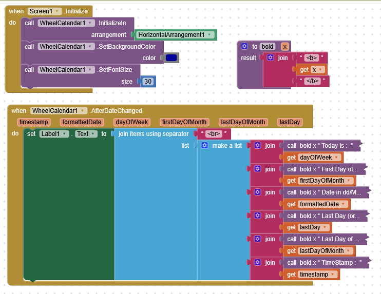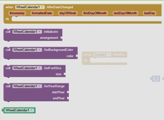 The Wheel Calendar Picker extension offers several blocks that allow developers to interact with and customize the calendar picker. Here is a breakdown of the available blocks and their functionality: