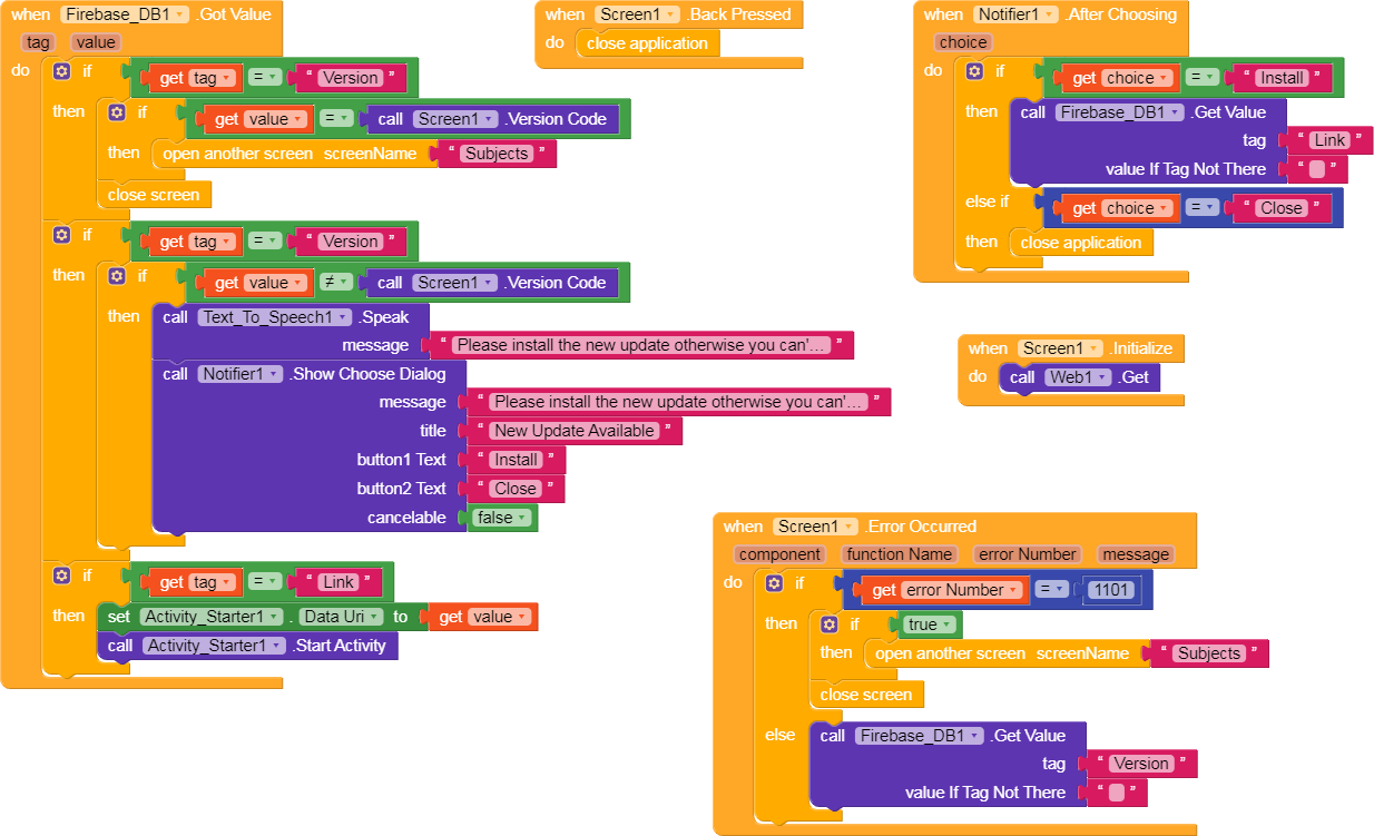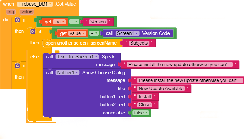 you are calling 2 functions same, like if get tag = version, then down same called it, if first do all blocks, like if get tag = Version then use if, get value = version code then open other scree, else call update blocks