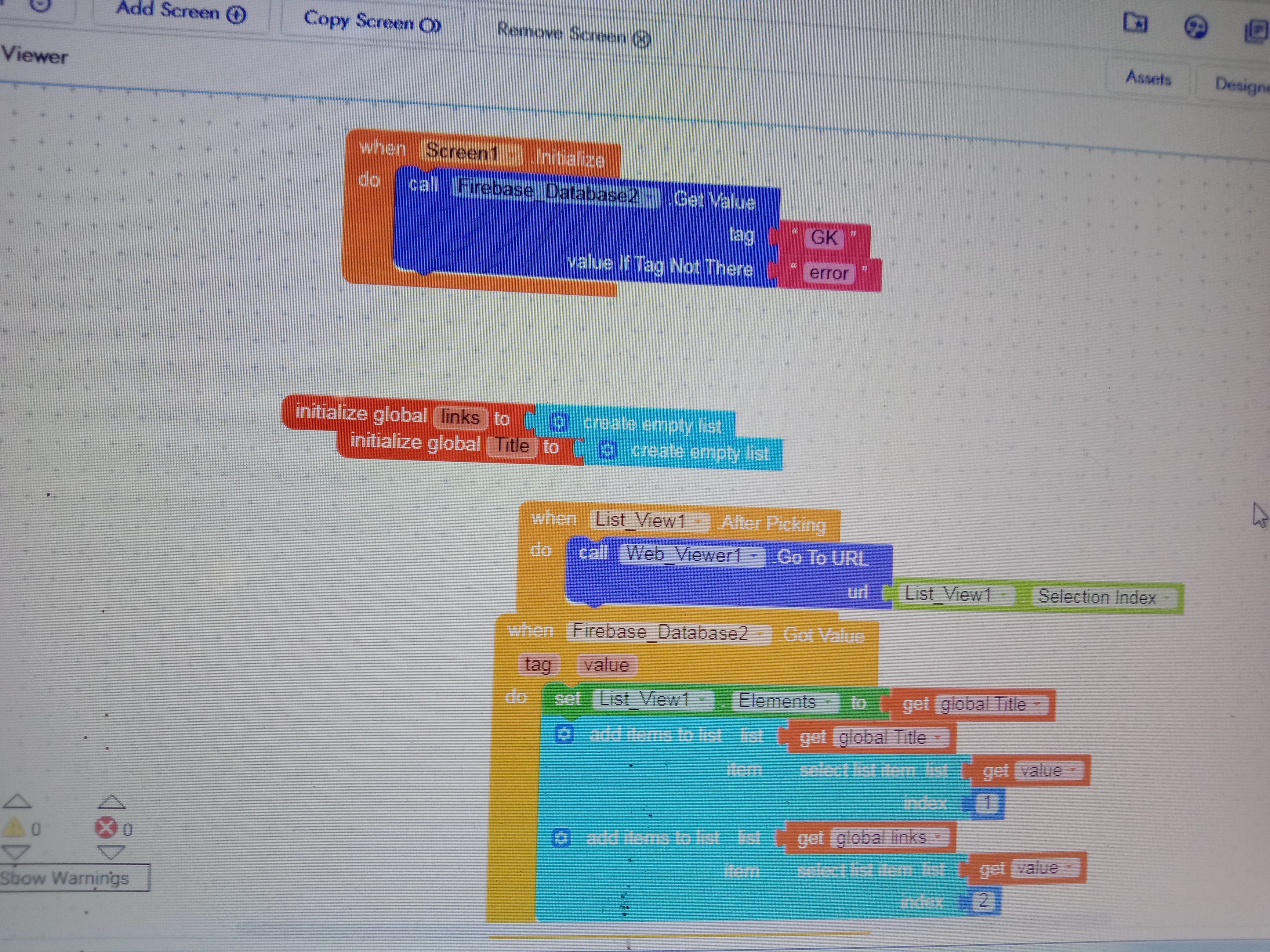 I am trying to create an study app. My data contains title and url. I want to load the titles when screen initialize and when click the title it opens the url. Can anyone help me with the blocks