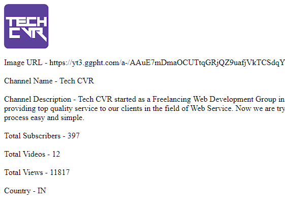 here UCHtb_C0znJqxcFnx6TSJCFg is my channel id. if you want to fetch your channel or any other channel details just change the channel id from the url.