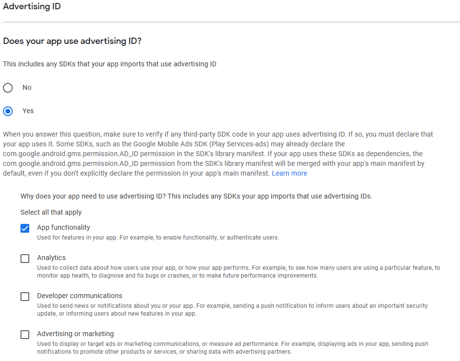 Are you saying select no for ‘Does your app use advertising ID?’