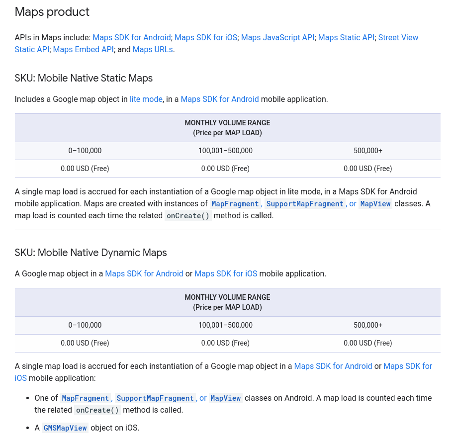 For what i use Google Maps for i guess it should be free. Just to show a map and project my own route and marker.