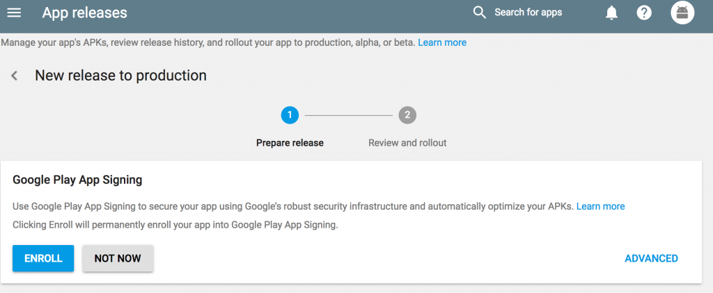 When you will try to upload the new production apk, you will be asked to Enroll for App Signing, please select Not Now