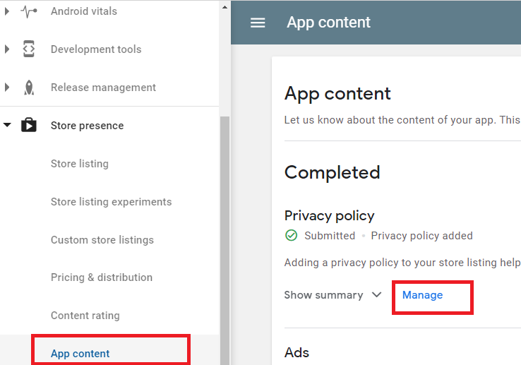 Then you take the link of your privacy policy and you copy it into the appropriate input field on Google Play. I’m attaching an image, so you see where to locate it.