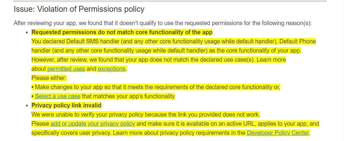 For the second point , i dint understand what they meant by Privacy policy link invalid.