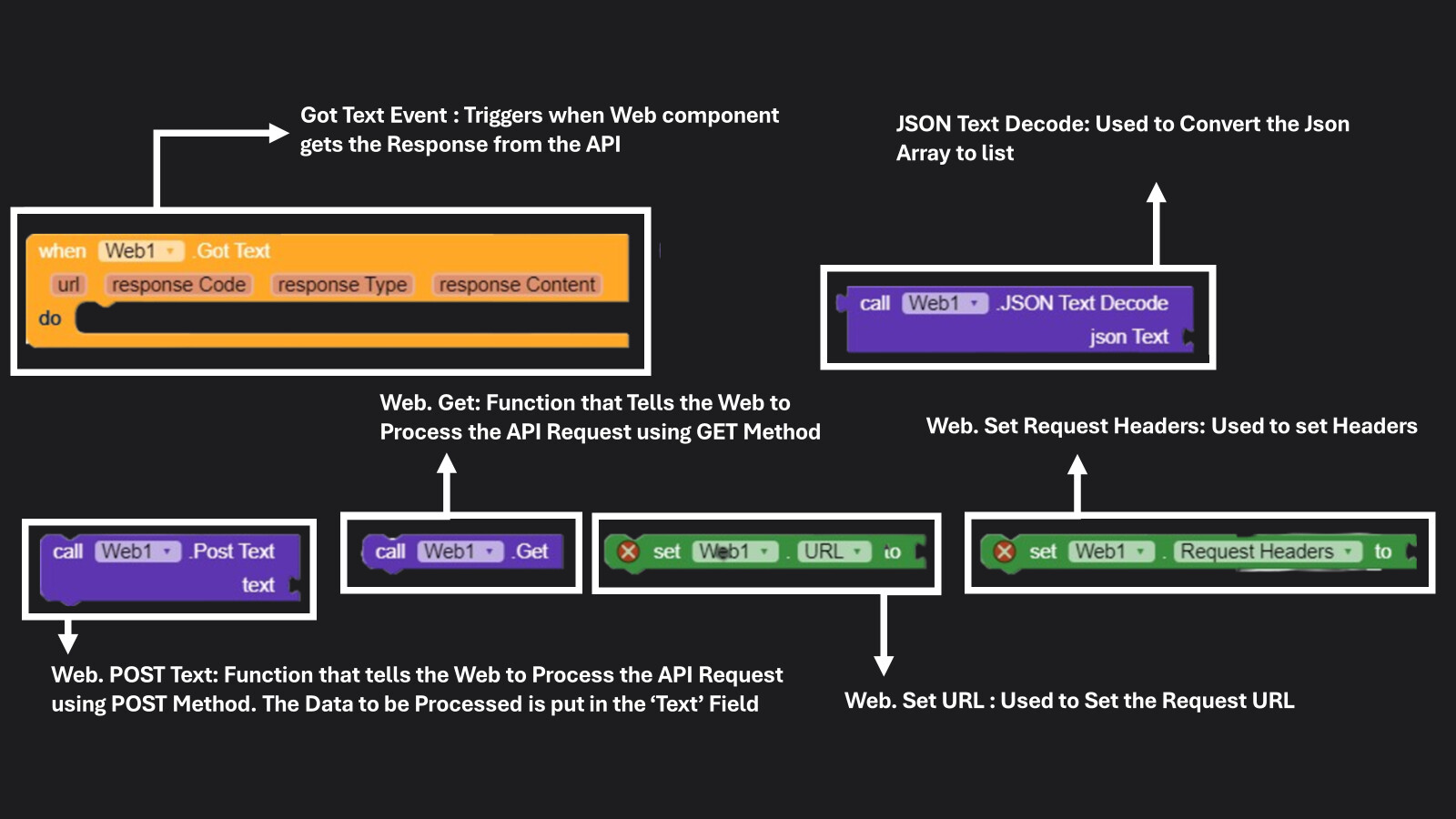 API Requests in Kodular are Made through the WEB Component. The Web Component is an Invisible Back end Component used to Process web requests in the Code. The Following Blocks from the Web Component are needed for API Requests:▶ Method 1: GET