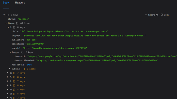 We Need the Title, Snippet, Timestamp, Publisher & one Image (thumbnail) from all the items (60 here).