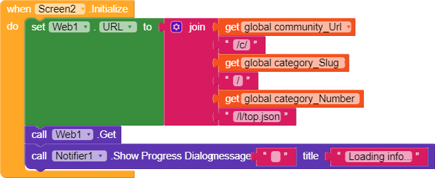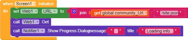When the screen initializes, we retrieves data from our community site and displays the notifier, indicating that the app is getting the data. Discourse provides an API for all Discourse sites to get a list of categories, by appending /site.json behind any community URL.