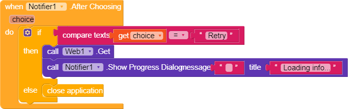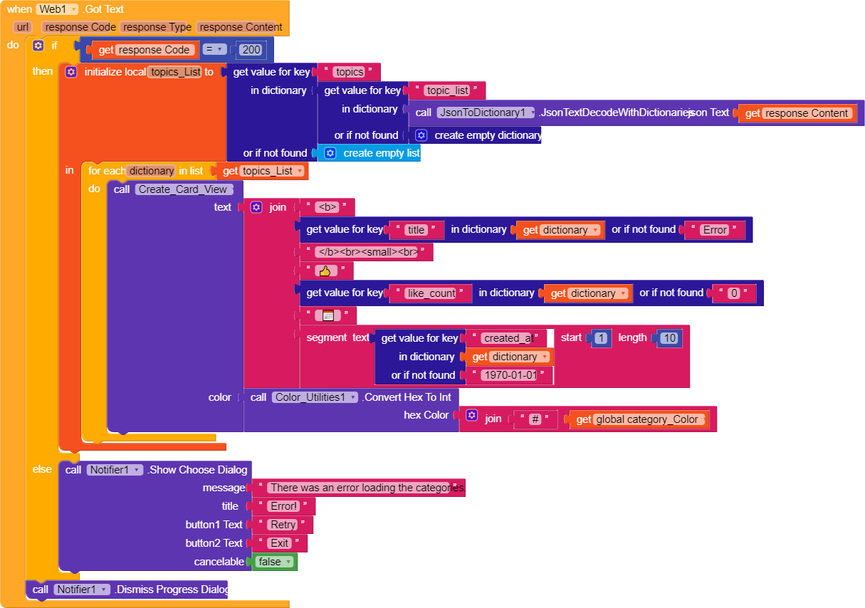Almost everything is complete, but this is the most important part. We need to respond to the Web component after it retrieves the data. We put the name of the category and the description inside the label, as the API returns the name, description and color of the category. However, if there is an error, we prompt a dialog asking the user whether to refresh or to exit the app.