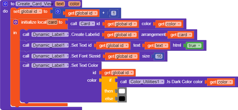 We create another void procedure named Create_Card_View that puts a label in the card. If the background color is dark, the text color of the label would be white, else black.