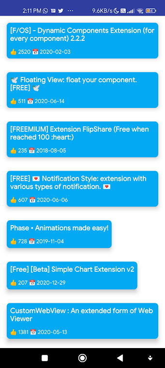 I did the same thing in App Inventor, however it requires multiple extensions and the UI does not look very good, so I tried the same approach in a different way and it works. The background color of the cards all match theirs in the community website (the color of Extensions is blue, the color of Community is brown), and their descriptions and titles all match.