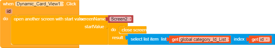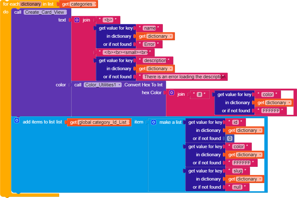 We create a procedure that helps us create a Card View for putting the category information in. We set the background color of the card and the ID, then return the Card View.