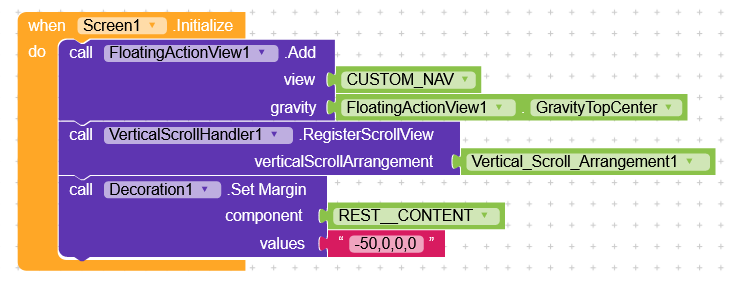 On the screen Initialize, run FloatingActionView Add method to float custom nav, run VerticalScrollHandler to register vertical scroller and add some margins to decorate your content.