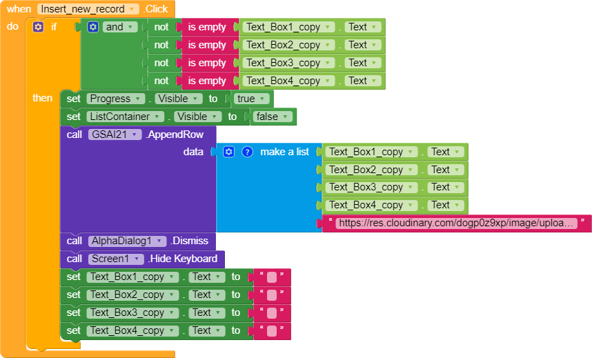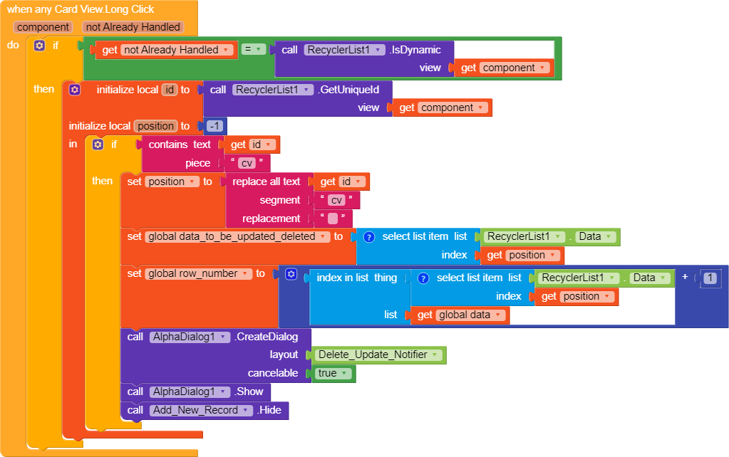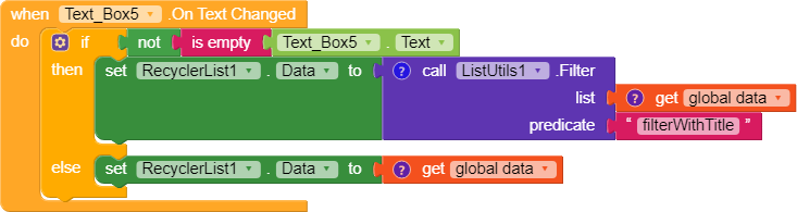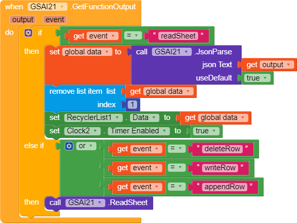 2. We use when GSAI2 GetFunctionOutput to add data to our global variable. The first if .. then condition is used when we received our data and second if .. then is used when we later delete, update or add a record to call data again from gsheet in order to refresh our RecyclerList