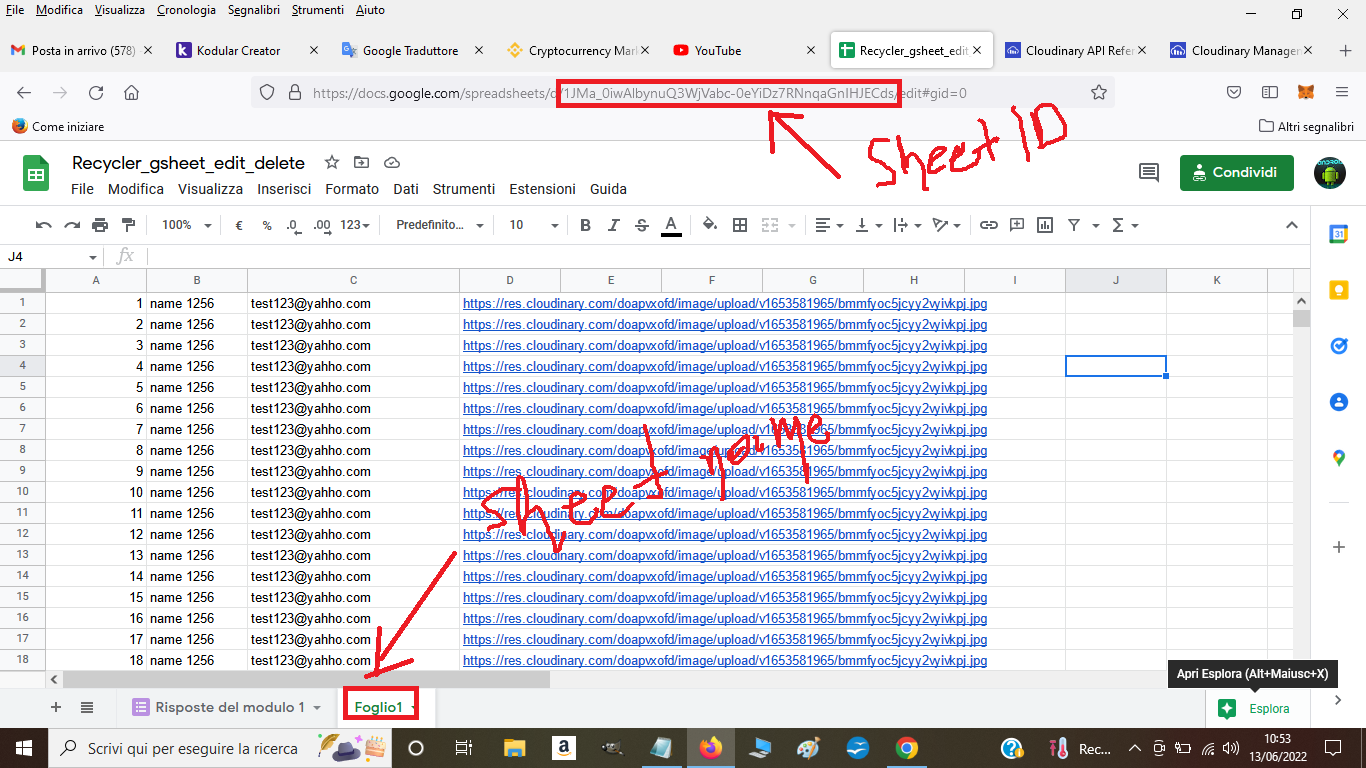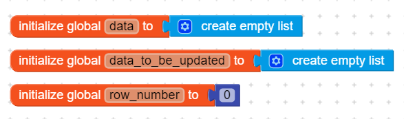 First of all we create three global variables, one will be populated with data from gsheet and two that we will need later in order to get row number and row’s data in order to update it or delete it .