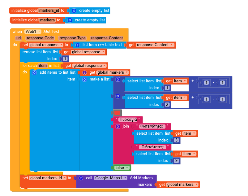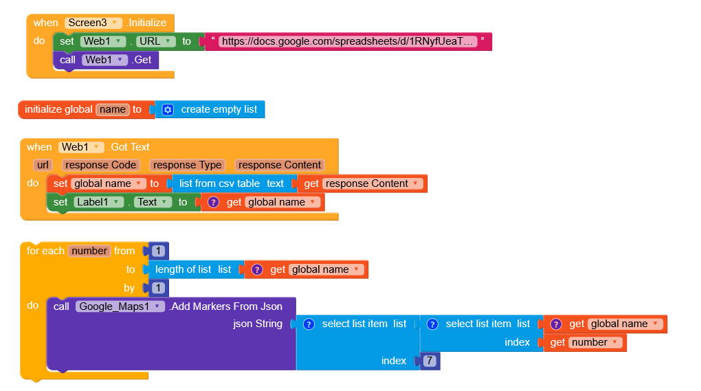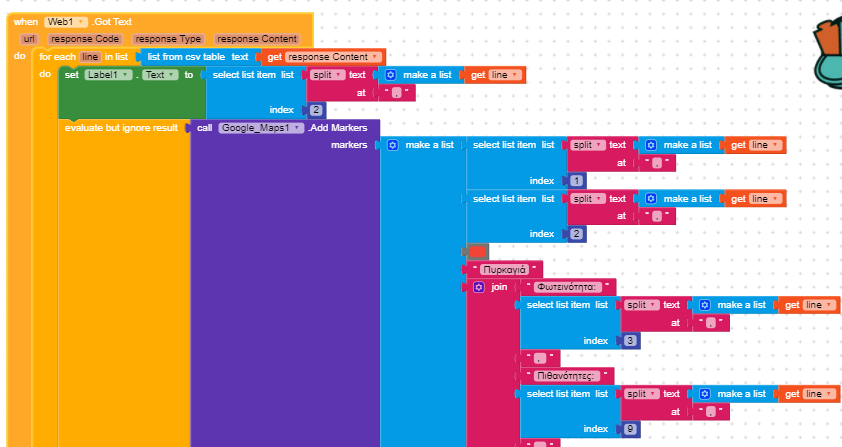 Everytime this specific screen initializes in my app, it gets a web response from a CSV file which later reads line by line. Every line has a string which separates diffrent things with a comma like this : latitude,longitude,brightness,scan and etc. All I need to do is to divide this string with every comma as a separator thus adding every separated item into a list and then finally using the “select list item” block and the index parameter it offers to receive any item I want. I 've been trying to do this for months now and it’s kind of a huge issue for me because there is no other practical alternative that I’m aware of. If anyone could help me with this I would appreciate it a lot.