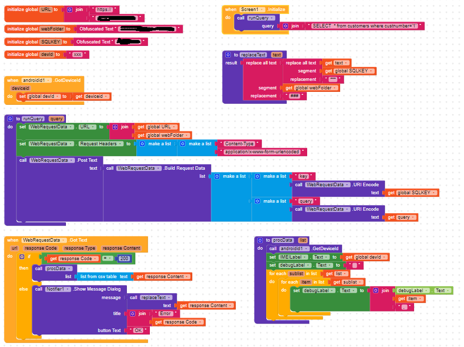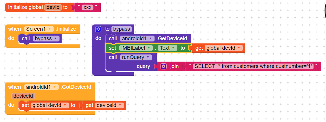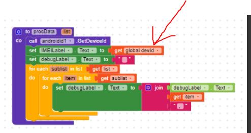 The place I put the label is not important as long as it is after the my variable devid is loaded with the value of deviceid captured by the extencion and also that it is only an aid to diagnose the reason for the problem and will be removed as soon as the app works.